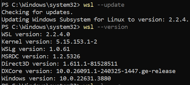 These commands ensure that WSL is up-to-date and displays the installed WSL version.
