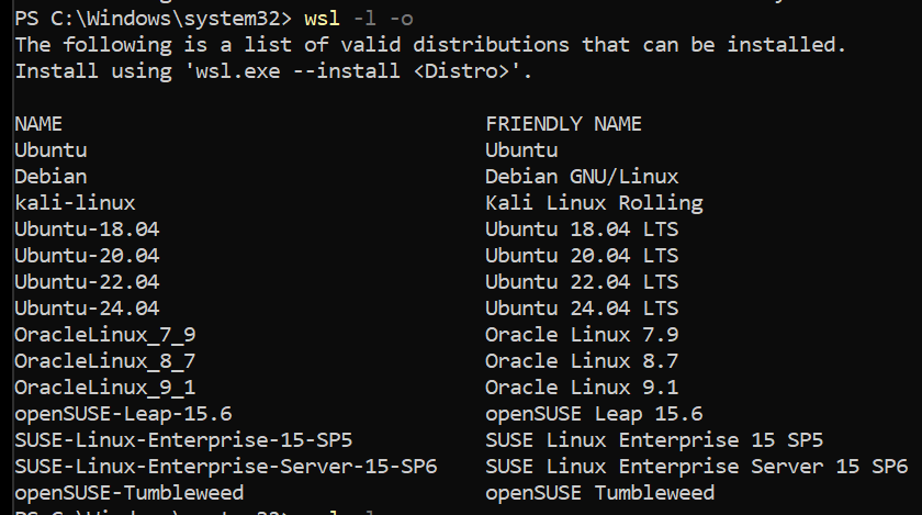 This yields a curated list of pre-packaged Linux distributions that Microsoft provides, making the process almost effortless.