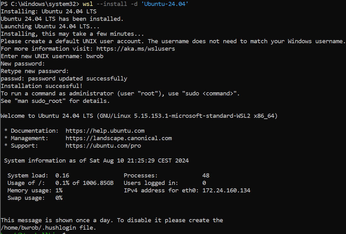 First, we need to set up the WSL and install a chosen Linux distribution. Fortunately, this is “super easy, barely an inconvenience”. You can choose from a list of distros pre-packaged by Microsoft or download and build an image from scratch. You can even build Arch and be legally allowed to say BTW, I use Arch (on Windows). For this guide, we’ll take a more conventional approach and opt for the long-term support (LTS) version of Ubuntu. Now, open the Powershell with administrative privileges and run: