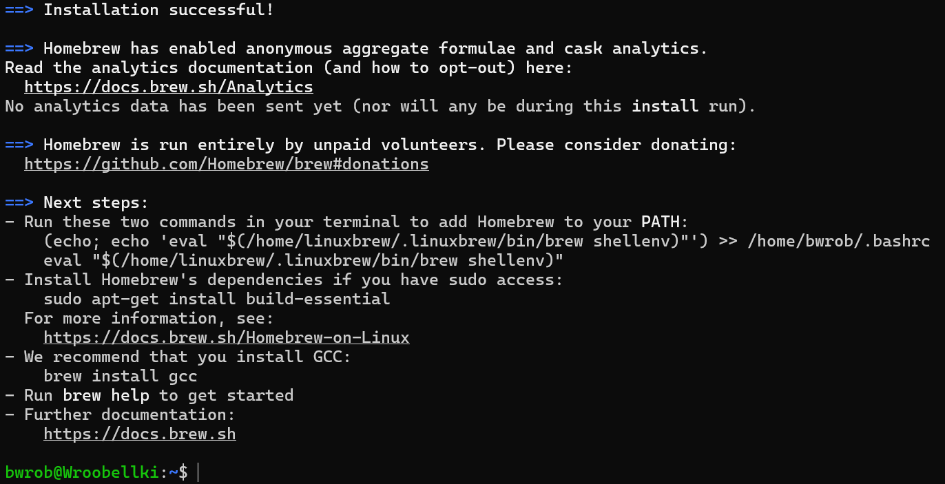 There is an additional benefit we can reap with just a bit of more work — a fully system-agnostic setup. By having Linux kernel run on Windows, we unified 2 out of 3 giants. The only pillar that is missing is the Mac OS. But wait, it’s based on Unix as well! It just uses different default shell and lacks a package manager, as Apple doesn’t trust its clients. zsh offers a more interactive and customizable shell experience compared to the default bash. Homebrew, often referred to as the “missing package manager for macOS”, provides a convenient way to install additional software on Linux systems. Let’s change the terminal shell to zsh in our Ubuntu installation and compile a secondary (to apt-get) package manager – brew.